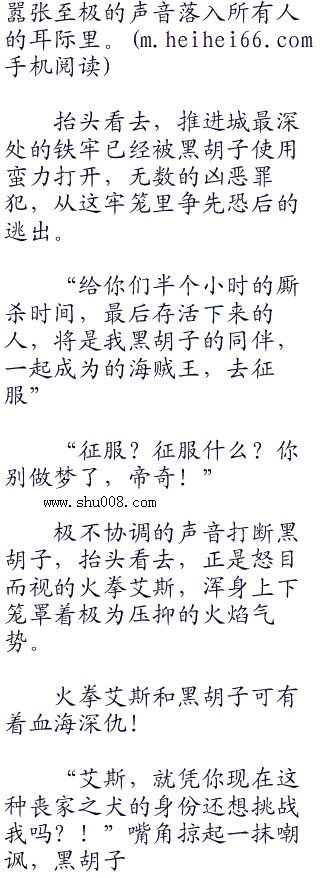 黑胡子船员之一的拉菲特调侃着,只见黑胡子面露狰狞的恐吓着这群海军,看到他们噤若寒蝉的模样,黑胡子嘴角咧起恶趣味的满足笑容。