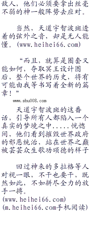 “不止我们几个,那些懂得冥王珍贵的势力,一定也会争先恐后赶到德雷斯罗萨,得冥王者得天下这种诱~惑谁能抵挡?你们不行,我也不行,全世界都不行。”