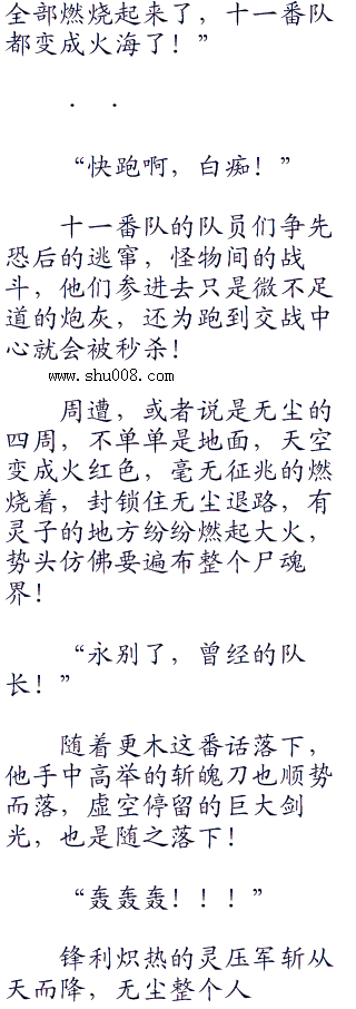 想起更木堪称无敌的灵压,无尘毫不犹豫的又使出其他招数,“破道之六十三·雷吼炮!”