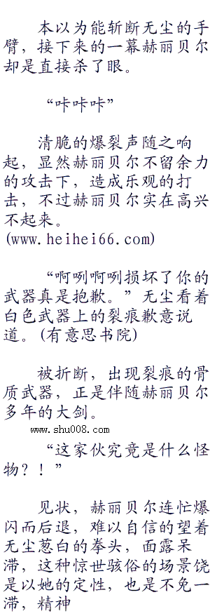 无尘的右侧,赫丽贝尔现身于此,眼见他压根没有意识到自己的存在,一声冷笑之后,赫丽贝尔那锋利的骨质大剑甩出。