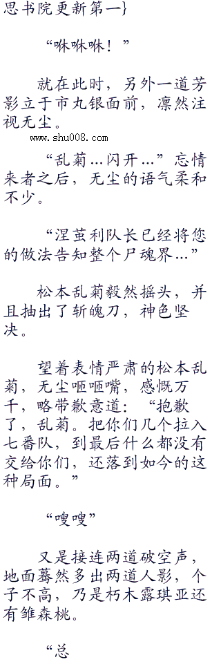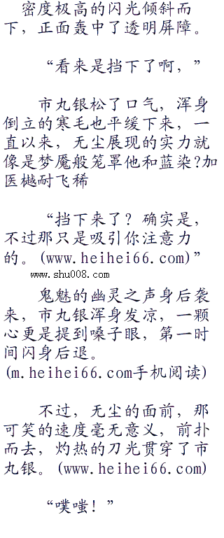 伴随着一声娇~喝落下,嘉蒂斯和邦比爱塔加力轰退围攻的死神们,暂时得以脱险,无奈的眼神看了无尘一眼之后慌忙离开,她们现在对于无尘来说只是负担。手机阅读更方便m..com