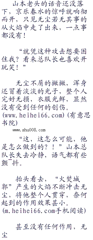 闷哼一声,山本总队长并不领情,抬手就是声势浩大的火焰攻击,像是泰山压顶的掠向无尘。