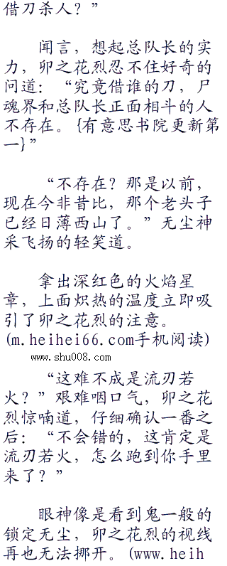 离开一番队队舍的时候,无尘直奔四番队,一路连跑带飞,一颗心格外愉快,夺走山本总队长的“流刃若火”,回想起总队长猪肝色的老脸,无尘格外舒畅。.com
