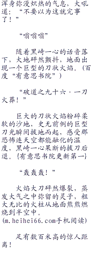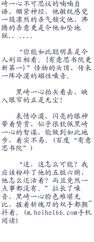 随手打开通往现世的黑腔,无尘半脚踏入其中,正欲离开虚圈的时候,身后突然卷起一阵暴风,紧接着便感觉心脏一疼。百度