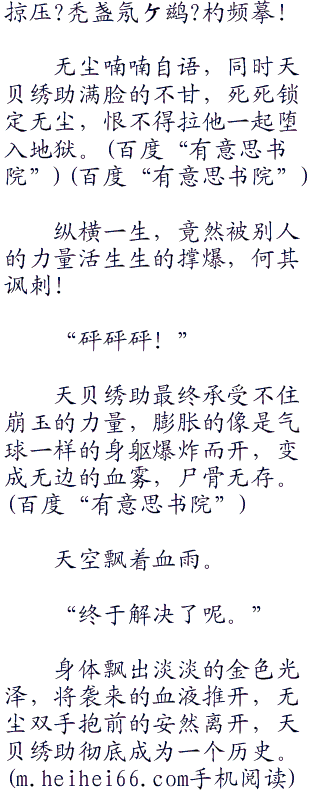 冷漠的盯着一分为二的天贝绣助,无尘手心溢出粉色的光芒,覆盖在他的身体上,一股烧焦的味道随之扩散。
