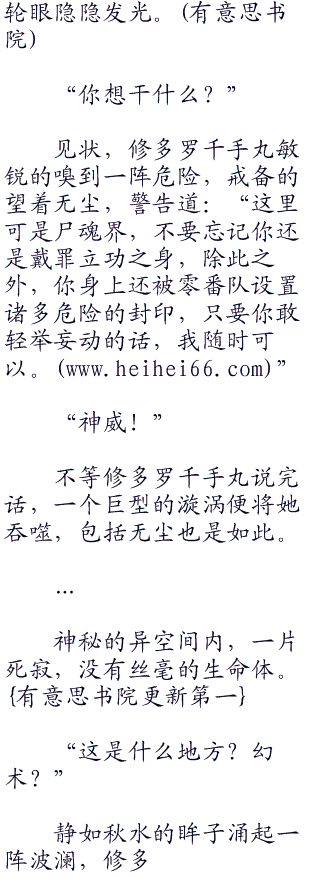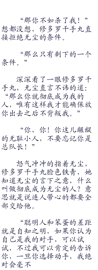 以前被这厮坑害,莫名其妙的被无尘看光裸~体,修多罗千手丸自然气得牙痒痒,除此之外无尘如今又暂时归顺与死神,这也算是她欣慰的地方。