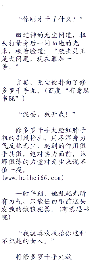 无尘忽然改变主意,清澈的双眼顷刻间变红,对付有的女人可以关怀备至,以炽热之心融化她,但对付修多罗千手丸这种清高女人,只能击碎她的尊严。
