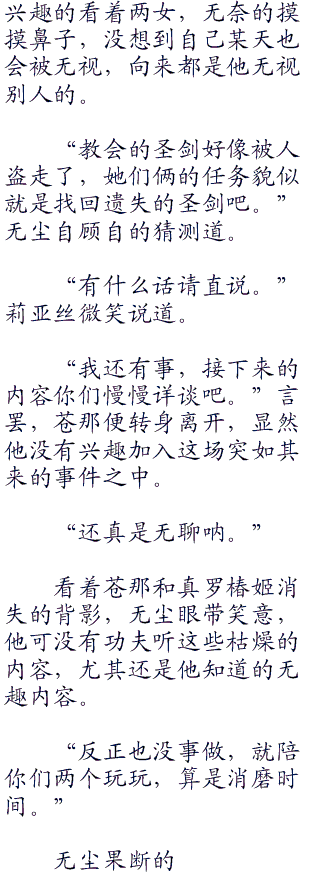打搅无尘好事的人,正是学生会长苍那,以及她的眷属真罗椿姬。首发