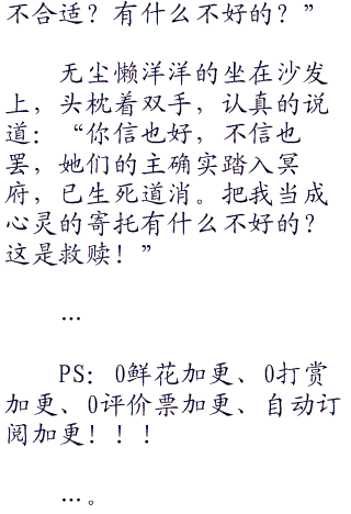 无尘浑不在意的反问,继而直说道:“反正你们的神已经挂了,信仰我这样一个更强的主灵魂才能得到宽恕。”