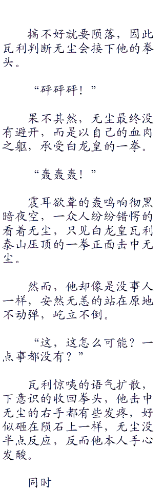 一记重拳落下,无尘腹部再次溃散,然而令瓦利郁闷的是,无尘本人一点事都没有,嘴角始终挂着浅淡的笑容,无声讥讽他的自不量力。