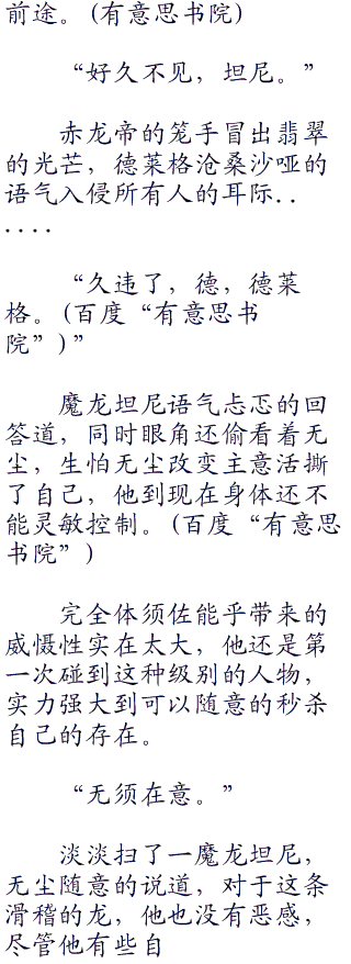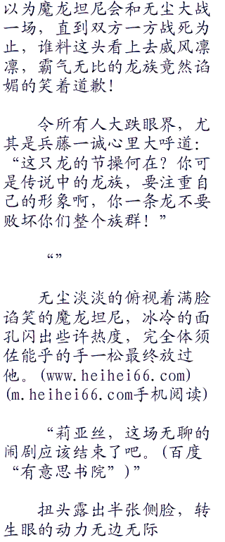 淡淡扭头扫了一眼心头上的魔龙坦尼,无尘从他的龙眼里读出亢奋,也许他已经陷入击败自己的美梦之中。