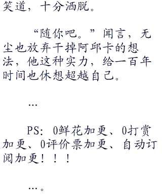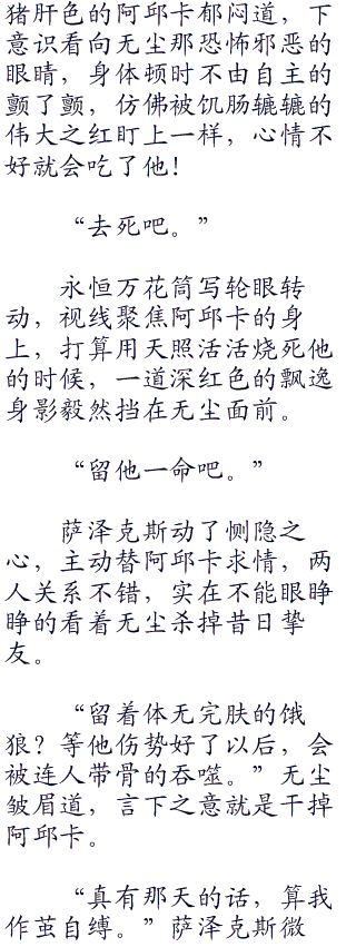 “你的遗言是什么,魔王大...不,前任魔王大人。”“三四七”漫步走到阿邱卡身旁,无尘面庞挂着胜利浅笑,刚刚赢得决斗胜利他心情不错。
