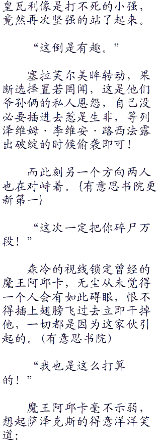 塞拉芙尔霸气凛然的说道,浑然不惧的瞪着列泽维姆·李维安·路西法,魔力爆发,挥手间就是无与伦比的强大攻击。