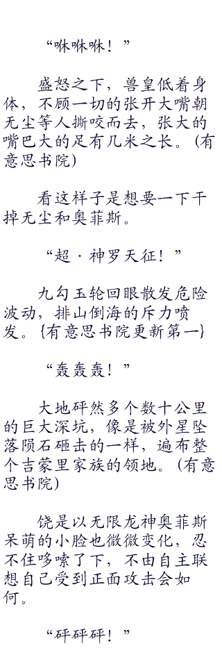 只见兽皇张开嘴巴,欲要报复无尘的时候,无限龙神奥菲斯这个忠诚的保镖,顿时回击