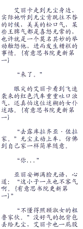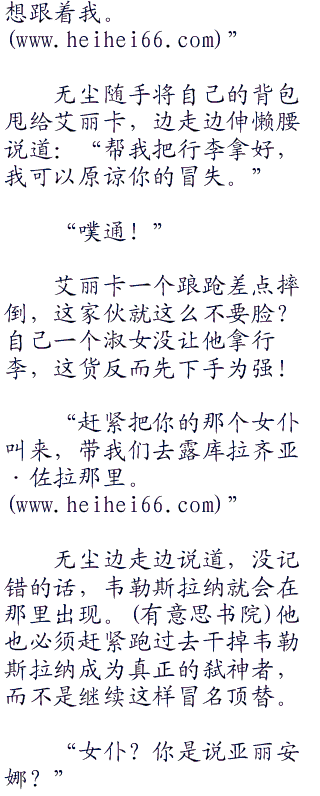 “是吗,那告辞了。”可惜耸耸肩,无尘和艾丽卡擦肩而过。