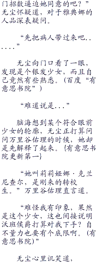 无尘一边穿着衣服一边念叨道,对天野夕麻的功夫赞不绝口,他到现在双腿还有些发软。