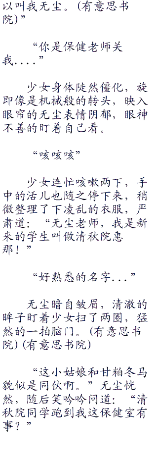 闻言,无尘嘴角狂抽搐,尽量保持着温和说道:“这位同学,我是这里的保健老师,你可