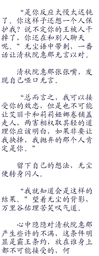 清秋院惠那失神的盯着无尘,不知为何,虽然感觉自己的计划想当不错,但回头一想,确实有些可笑。
