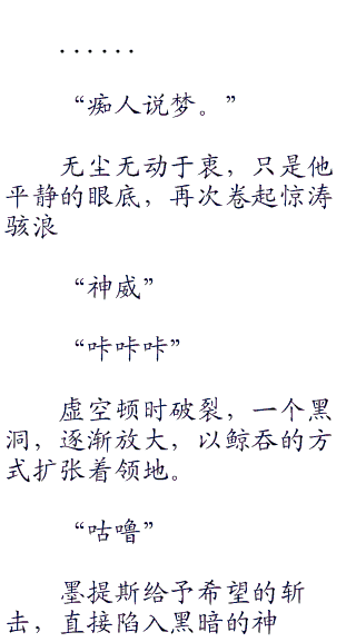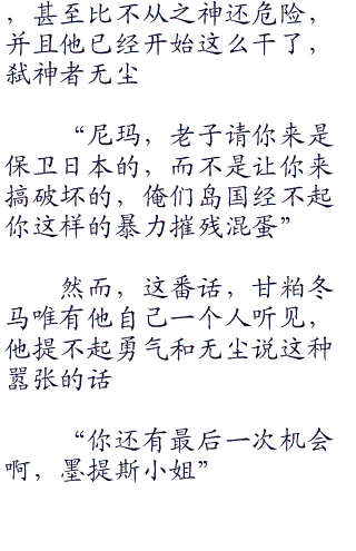 甘粕冬马呆呆观察天际上的两人,以前他一直以为毁灭日本的将是不从之神,现在忽然意识到自己大错特错。
