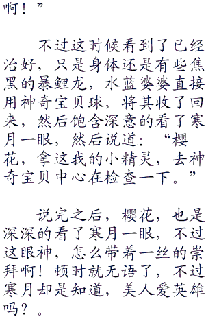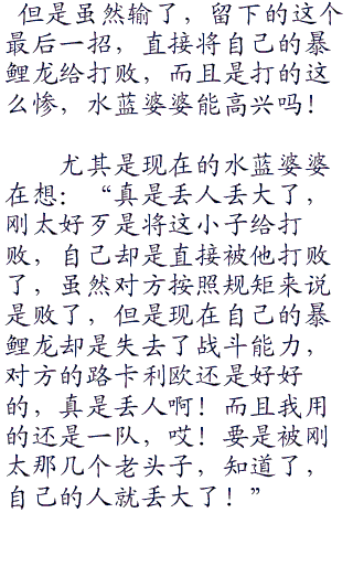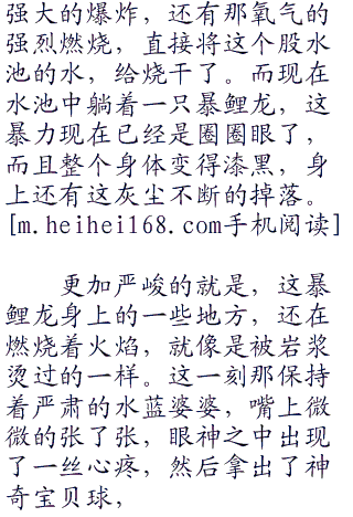 然后从神奇宝贝球上射出一道红光,将路卡利欧给包围住,然后瞬间这个水池燃烧了起来,然后瞬间发出了巨大的爆炸,火焰四散,巨大的爆炸声,还有一声暴鲤龙的惨叫声,以及水面上斯斯的声音。