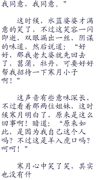而这时候的水蓝婆婆,双眼微睁,看着寒月就是不说话,不过那眼神则是打量着残月,仿佛要看出什么来着。