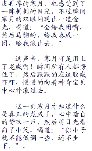 不过娜娜美竟然直接愿意将这只迷你龙送给寒月,可见娜娜美对寒月的爱意,不过寒月虽然有些感动,但是对于言听计从的娜娜美一起做出了整治小茂的事情,而小茂,长时间是和娜娜美在一起的,所以被整治的,一听到娜娜美的名字就,恐惧。