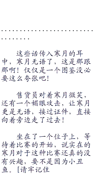 寒月将视线,扫视了一番,最后将视线放到了,那奖台上的一个水缸之中。一条褐色带着一些斑点的小丑鱼,出现在了寒月的眼中。