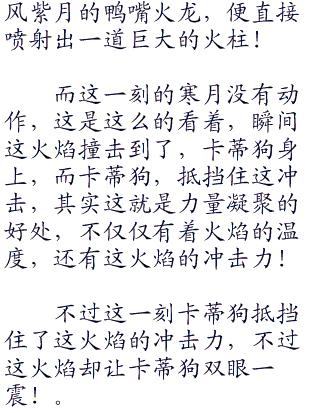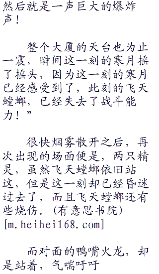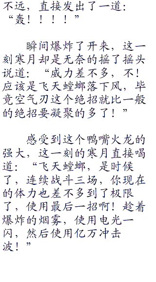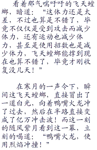 而这时候寒月的身边,以及出现了飞天螳螂的身影,看着飞天螳螂,和那喷火龙肚子上的伤痕,寒月微微的摇了摇头,喝道:“刀刃确实很锋利的!但是攻击喷火龙的肚子却是不可取的,记住弱点攻击,弱点攻击,明白了吧!不过总体上还是不错的,继续努力吧!”