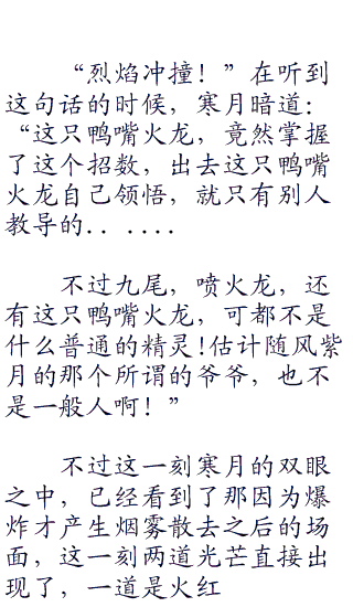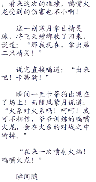 说完的随风紫月扔出神奇宝贝球的时候,瞬间喝道:“出来吧!鸭嘴火龙!”