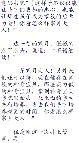 这时候井上管家却是笑了笑,说道:“寒月大人,若风小姐现在却是在真新镇。寒月大人的母亲,花子大人前几天联系若风小姐,说自己一个人在真新镇太无聊了,让若风小姐过去陪陪她!所以若风小姐便已经前往真新镇陪花子大人了!”