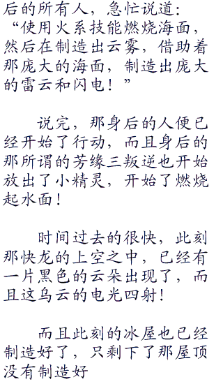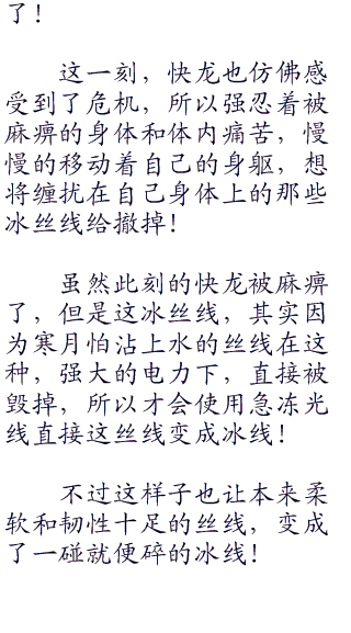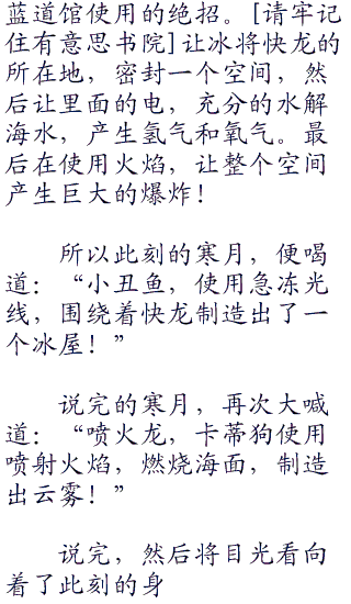 这一刻的寒月再次,大喝道:“使用急冻光线,围绕着快龙制造出了一个正方体的冰屋,将快龙给装在里面!不过不要将大海里面的那些海水给冰封住!”
