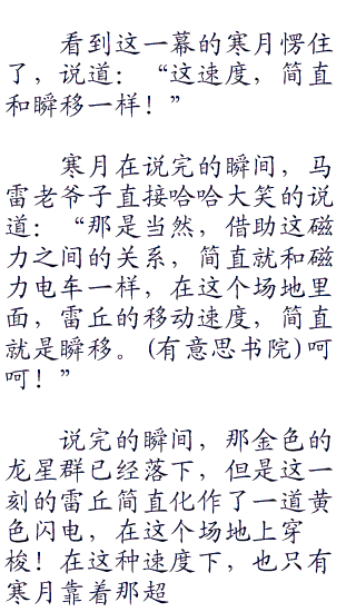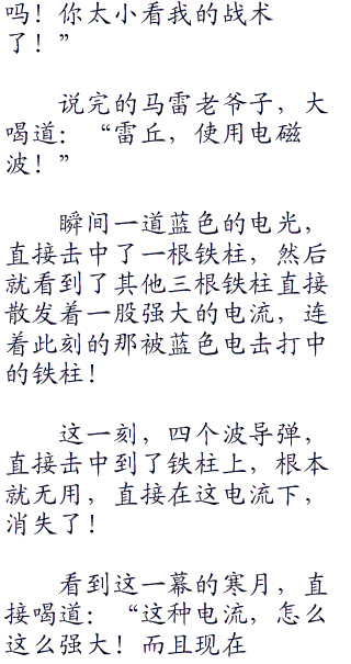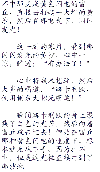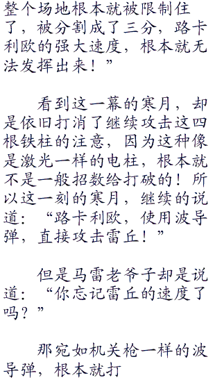 瞬间的那一刻,雷丘只见使用了一道黄色的电流,只见击中到了一根柱子,然后就看到了此刻的雷丘,只见在这电流下,快速的跟着电流的方向飞去!然后落到了一根柱子上!