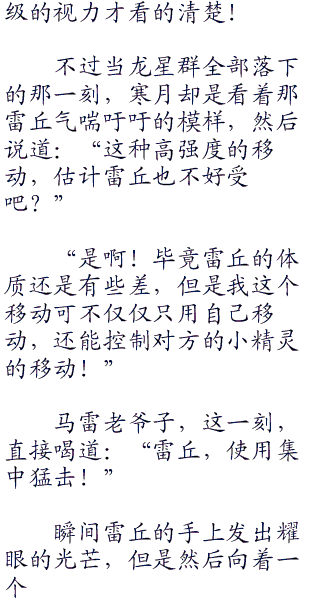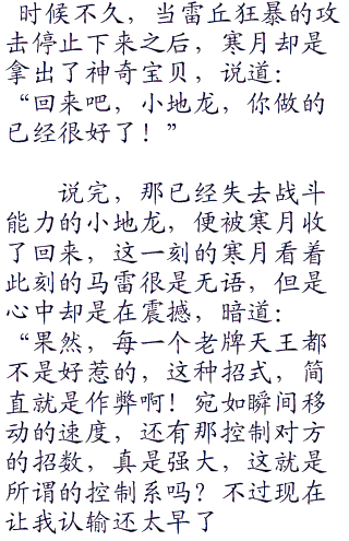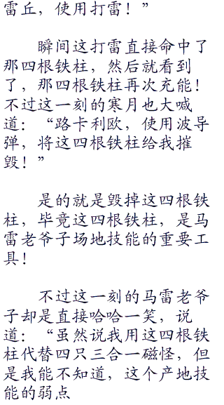 而马雷看到这一幕,却是微微的一愣,说道:“完美的利用流沙场地吗!在流沙里面,小地龙的移动速度会更快,使用替身来迷惑我的雷丘,然后趁机在雷丘的脚底,使用大招。真是不错的计划。不过我的雷丘,虽然体力不强大,但是也不是一个神龙俯冲能解决的!”
