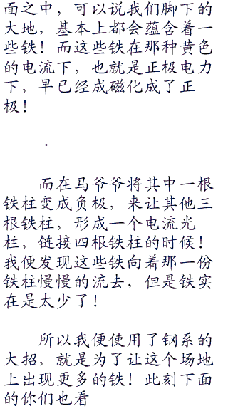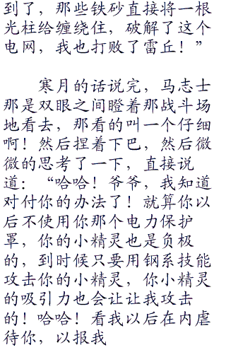 然后这银白色的沙粒,慢慢的向着那散发着蓝色光芒的铁柱飞去,开始只是一点,但是随着路卡利欧不断使用光缆炮,然后就看到了,此刻那散发着蓝色电流的铁柱,在这时候已经被银白色的铁砂给包围住了,而那散发着三条电柱的铁柱也已经消失了!