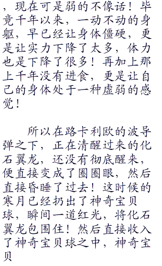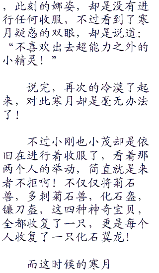对于这两道目光,寒月却是目不斜视的看着此刻,那中心地点的一只化石翼龙,嘴角说道:“你们也别害怕,这些化石神奇宝贝沉睡了这么长的时时间,醒过来之后还有多少实力!而且饿了这么久,他的体力还有多少!所以不要傻愣愣的,拿出你们的神奇宝贝,看上眼的直接收复就行了!”