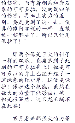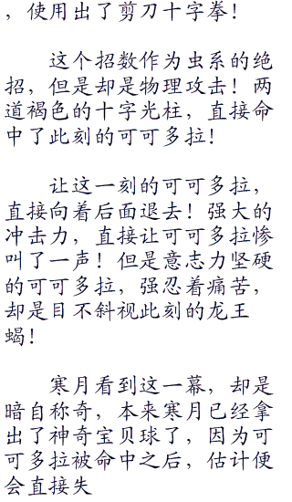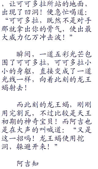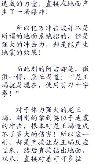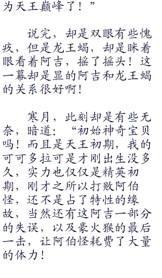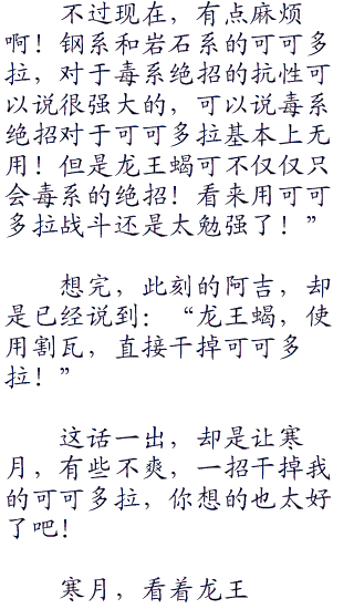 不过对面的阿吉,却是只剩下,现在场上的那只龙王蝎了,其他的两只神奇宝贝叉字蝠和阿伯怪,已经失去了战斗能力!
