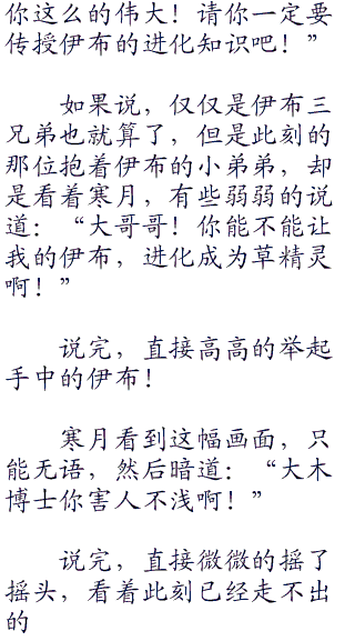 说完,傍边的黄色头发的却是,直接喝道:“大哥,才不是这样子呢!你也知道大木博士刚刚发布了资料,说伊布有八种进化啊!”