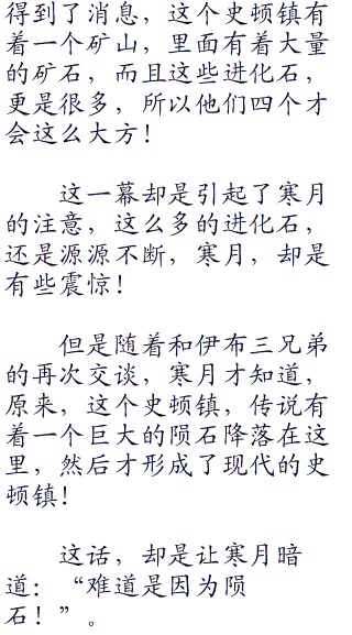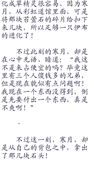 说完,那个红色头发的,貌似是大哥,直接说道:“那这是水之石,这个是火之石,这个是雷之石!你想让你的伊布进化成什么样子啊!”