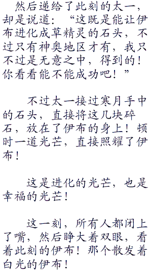 “你也是伊布的训练家吧!真是太幸运了,没想到在这里会遇到伊布的训练家!那么你想让,你的伊布进化成什么呢?”