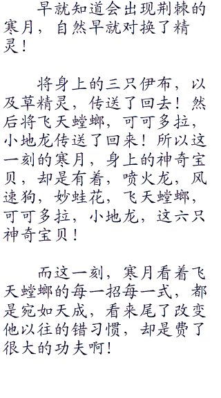 不过伊布四兄弟也不亏,除去寒月帮太一的伊布,进化成了草精灵,更是将伊布的八种进化型,一一介绍!这些知识对于伊布四兄弟来讲,估计是很宝贵的!