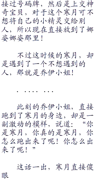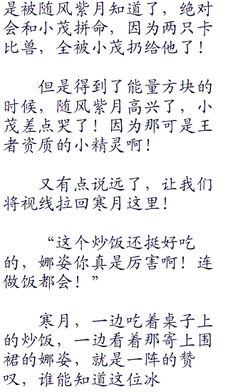 这是寒月的声音,这日寒月和娜姿来到了一条小河边,而且正值正午,所以便停下来休息片刻,然后吃点东西!以及喂养小精灵!