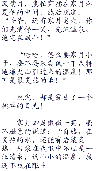 “寒月老大,你这就话却是说对了,红莲岛别的不多,就是温泉多,尤其是在红莲岛的高处,那温泉就更好了!等等我带你去我爷爷家,我爷爷家的那个温暖,却是神奇!一从火山口链接过来的,可以说胜过那些店家温暖的数百倍!”
