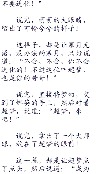 而这时候,寒月脖间的大师球,却是直接出现了一道亮光,然后出现了一直梦幻,这时候梦幻,揉了揉萌萌的大眼睛,看着超梦,然后围绕着超梦转了一圈,然后小鼻子却是轻轻的嗅了嗅超梦!