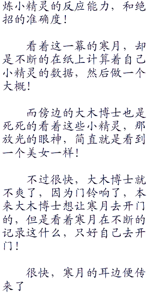 这一月,寒月却是很忙,虽然没有出去旅行,但是却在家于大木博士的研究所来回游荡,而寒月的也是在进行着对于小精灵的调整,毕竟关东联盟近在眼前,而且这一次的关东联盟,可不想以前的关东联盟了!