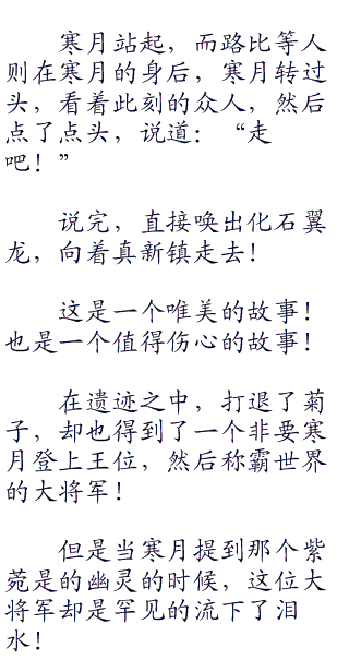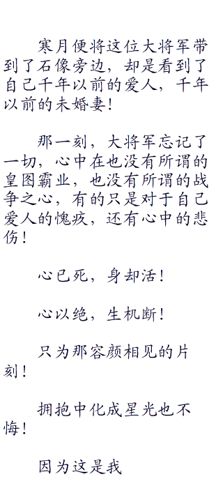 这一幕,寒月看在眼中,眼角也是默默的流下了感动的泪珠,心中却是默默的说道:“千年的等待之化作今天的一次期待!这期待却是来的慢,却也走的快!爱之永恒,身化石像,灵魂尽散!”