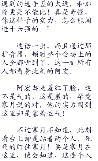 不过运气很好,这一次的十六强的比赛可以说不叫轻松一点,毕竟寒月可没有遇到路比等人,而且路比等人也没有遇到彼此,所以这一次十六强比赛,可以说是相当轻松了!