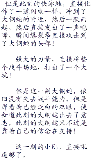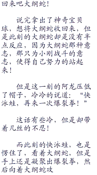 说道这里,此刻的阿龙已经咆哮了起来,然后直接大吼道:“快泳蛙,使用爆裂拳,给大纲蛇最后一击!”