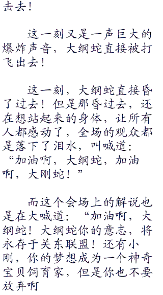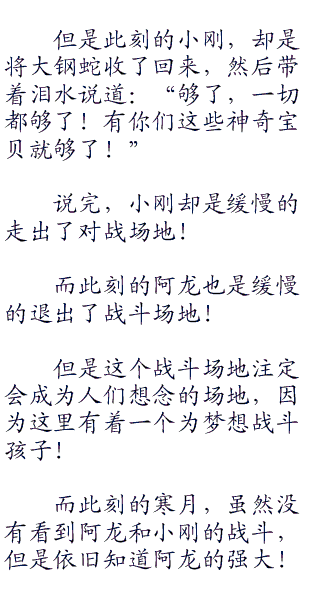 小刚此刻却是双眼流下了泪水,看着场地上已经躺在地上的大钢蛇,激动的大吼道:“不要倒下去啊!不要倒下去啊大钢蛇!”