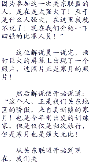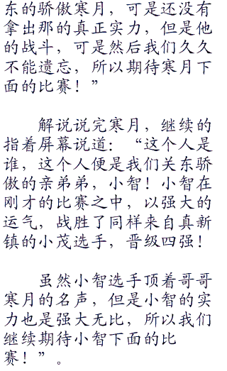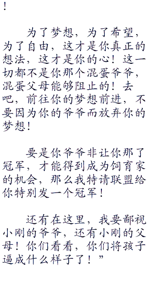 但是梦想是梦想,努力却是努力!尽然你能为了一个冠军,为了一个得到冠军便能得到你得到自由的承若,奋斗到这种地步,那你干脆拿出你的勇气,拿出你的意志,直接去做你自己想做的事情,而不是在这里哭泣!”