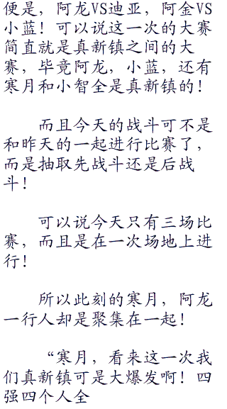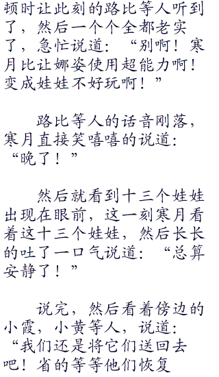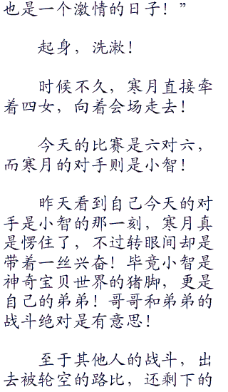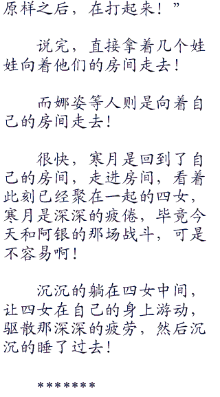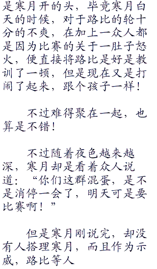 寒月总共十四人,此刻却是聚在一起,但是看现在这样子就知道聚集错了,除去小蓝和小黄,以及水晶,在寒月傍边吃着食物,看着美丽的月色!其他的几个男生,却是直接开始打闹了起来,而且还没完没了了!
